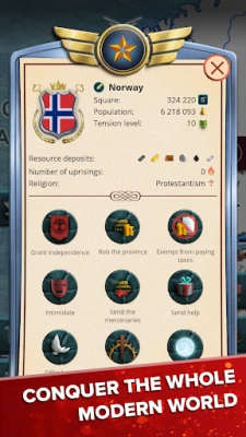 Choose military and economic laws to develop your country. Select the best religion to unite your population: Christianity, Islam, Hinduism, Judaism, Shintoism and more. Pick the right ideology to move your country forward: Capitalism, nationalism, conservatism, liberalism and more.